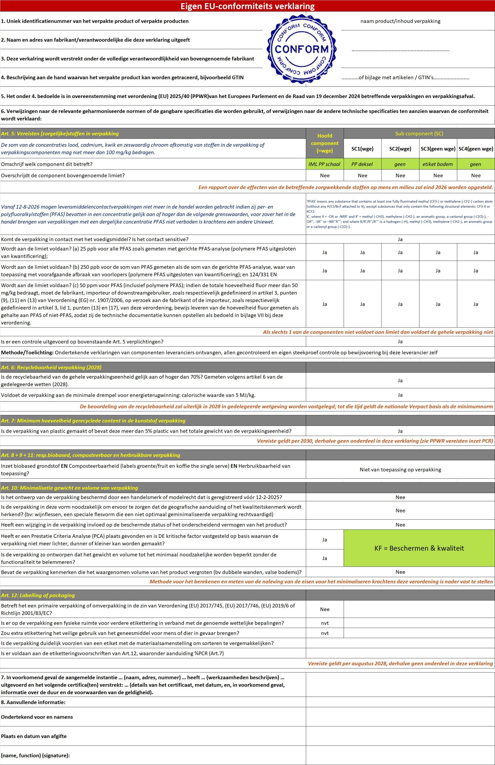 Natuurlijk heeft u een verpakkingsdata admin, via ‘n PLM/PIM/ERP systeem of, zo leert de praktijk vaak, in ’n excel. Voor uw opgave aan bijvoorbeeld Verpact of ander UPV organisatie vaak doenbaar. Echter een Prestatie Criteria Analyse(Art.10,24 bijlage IV in PPWR) als onderdeel in uw Technisch Dossier kunt u daar niet in kwijt. In de basis is dat niet mega complex maar t.a.v. de bewijsvoering en vastlegging toch soms tijdrovend. Welnu die basis hebben wij alvast voor u gelegd, gevuld met verpakkingskennis. U kunt het naar eigen inzicht aanpassen, dupliceren naar het aantal verpakkings typen welke u vervolgens specifiek maakt voor uw situatie, verpakking en te verpakken of af te vullen product. Input wordt automatisch overgenomen in de "eigen conformiteitsverklaring" welke u daarmee direct heeft opgesteld.