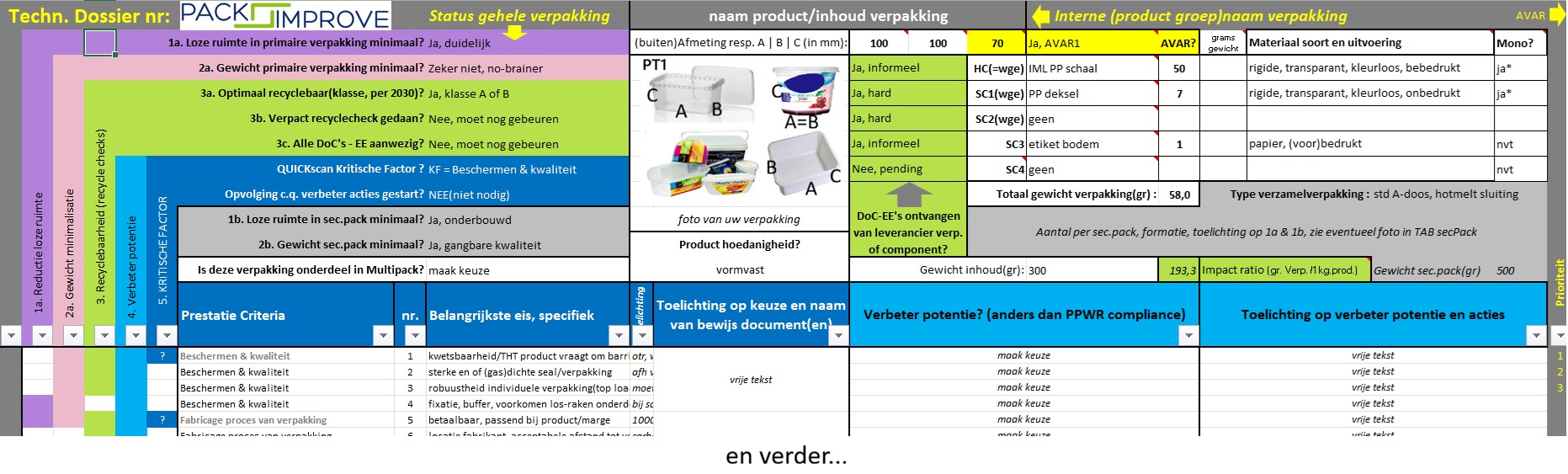 Bovenstaande ervaring, onze kennis van de PPWR, verpakkingskundigheid en een pragmatische aanpak heeft geleid tot een uitgebreide Excel werkblad welke Pack Improve heeft ontwikkeld. Met daar in een gestructureerde aanpak, checklist, template, compact en overzichtelijk maar toch volledig en inzetbaar voor de mainstream verpakkingsspecificaties.